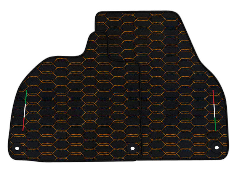 Precision-engineered Black Leather Floor Mats with distinctive Orange Sewing, specifically designed for the Lamborghini Temerario (2025-2026). These bespoke mats feature premium black leather with contrasting orange stitching that complements your supercar's interior design language. The vehicle-specific construction ensures perfect fitment, while the reinforced perimeter and waterproof backing provide superior protection against dirt and moisture. Advanced anti-slip technology keeps the mats securely in place during aggressive driving, preserving both performance and luxury aesthetics.