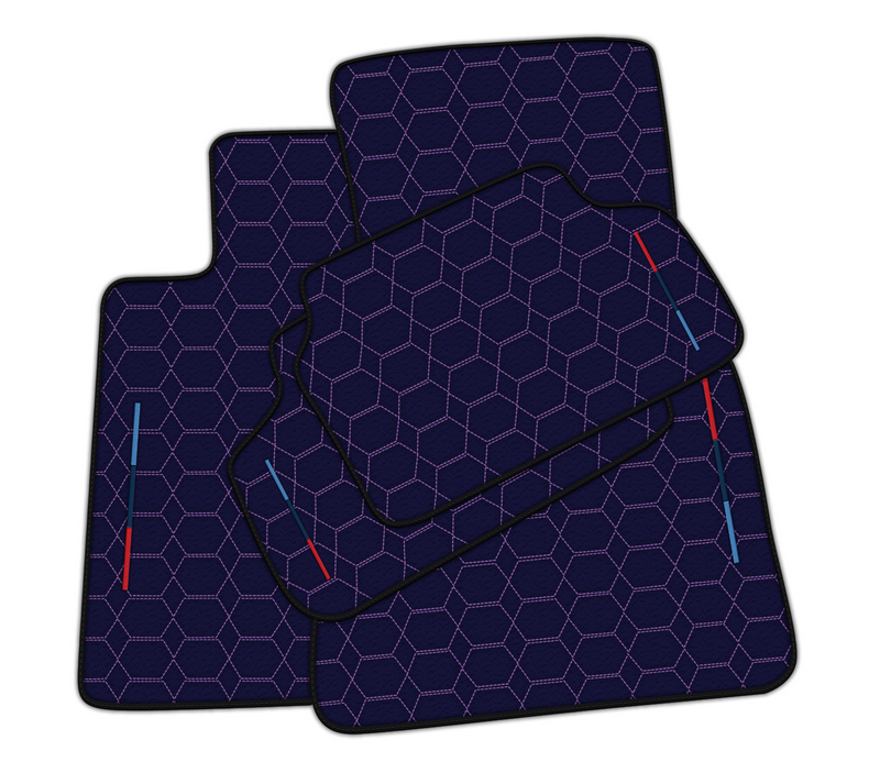 Verschönern Sie Ihren BMW mit unseren dunkelblauen Lederfußmatten. Mit stilvollem Hexagon-Muster, violetten Nähten und dem dreifarbigen M verleihen diese Matten Ihrem Innenraum einen Hauch von Eleganz. Sie schützen vor Abnutzung und verleihen ihm einen luxuriösen Touch.