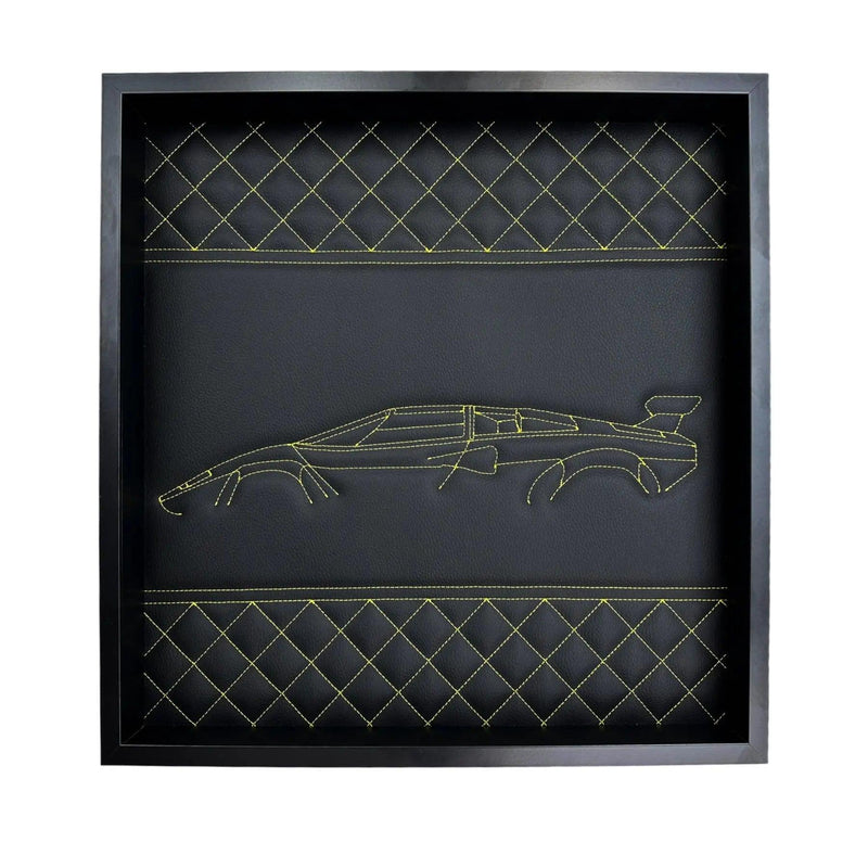Vom Lamborghini Countach inspirierte Wandkunst aus schwarzem Leder: Luxusdekor mit bestickten gelben Nähten