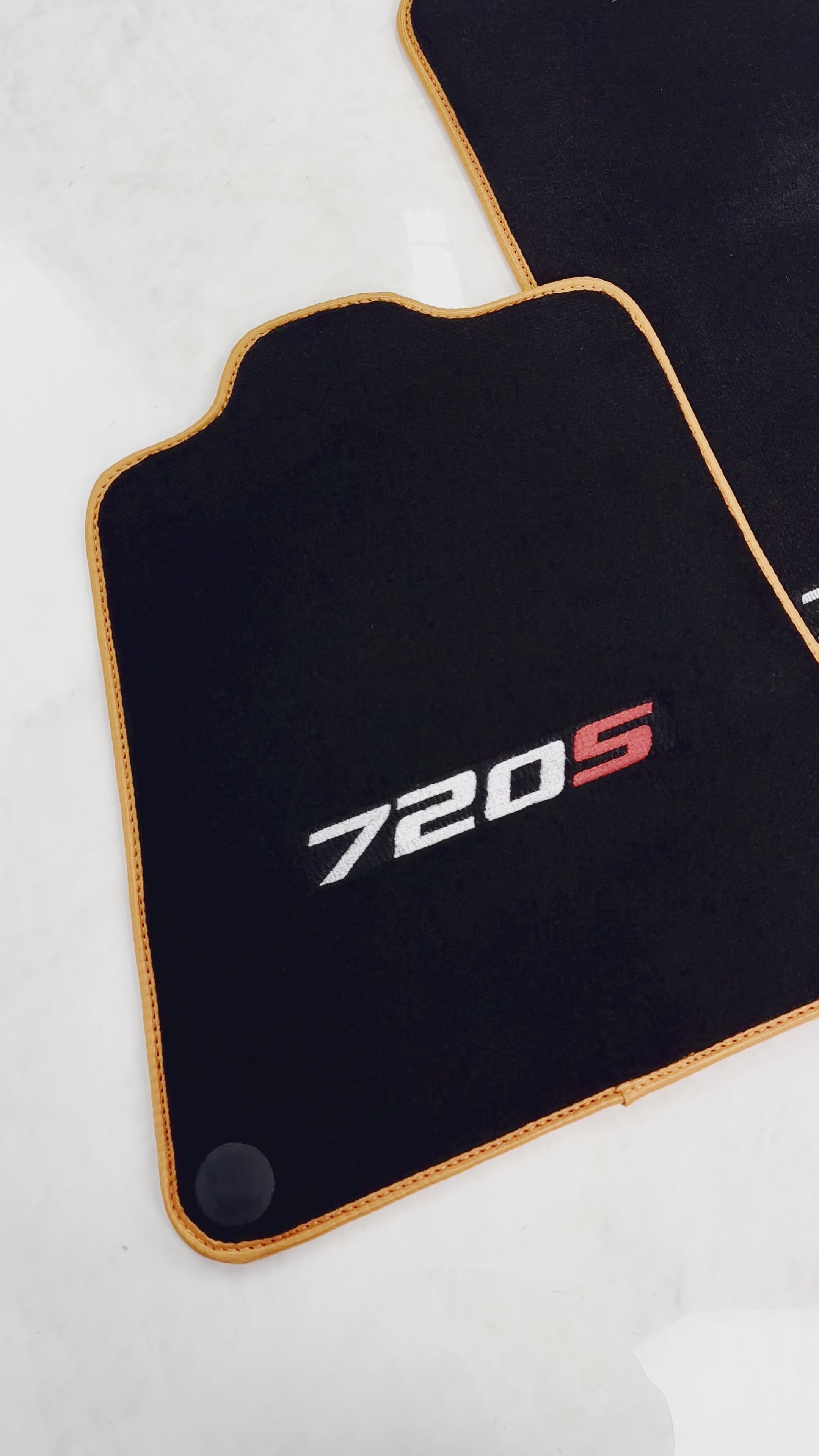 Fußmatten für McLaren 720S, schwarz, maßgeschneidert mit orangefarbenem Rand