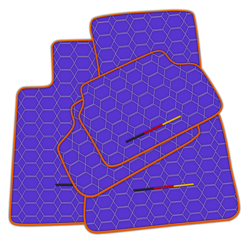 Werten Sie den Innenraum Ihres Autos mit unseren lila Lederfußmatten für BMW auf. Diese Matten aus hochwertigem Leder bestechen durch ein stilvolles Sechseckmuster mit weißen Nähten und auffälligem orangefarbenem Rand. Zeigen Sie Ihren deutschen Stolz mit der mitgelieferten deutschen Flagge. Steigern Sie Ihr Fahrerlebnis noch heute.