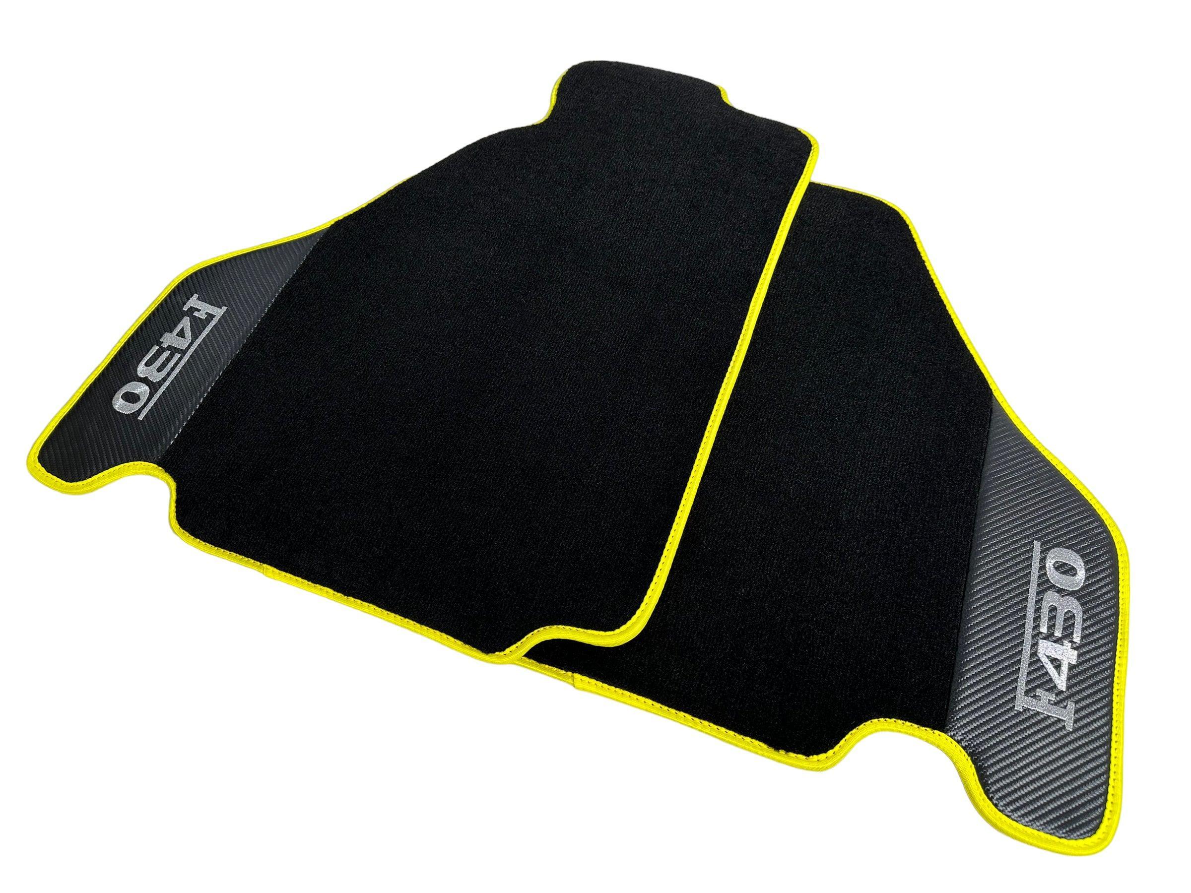 Schwarze Fußmatten für Ferrari F430 2004–2009 mit gelbem Karbonfaser-Lederbesatz