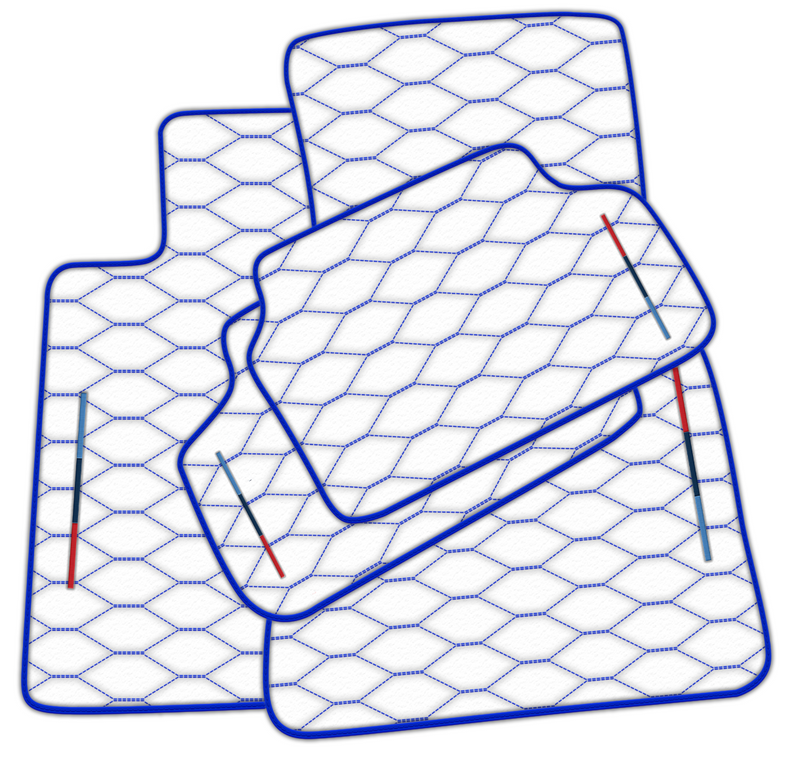 Unsere fachmännisch für BMW gefertigten weißen Lederfußmatten bieten einen eleganten und luxuriösen Look. Mit blauen Nähten im Viper Hex-Muster und dunkelblauem Rand werten diese Matten die Gesamtästhetik Ihres Fahrzeugs auf. Hergestellt in Tricolore, bieten sie Stil und Funktionalität zugleich.