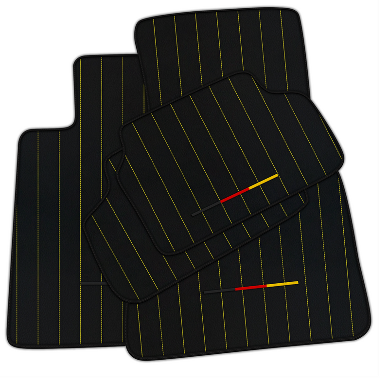 Oppgrader din BMW med våre svarte skinnmatter. Med et stilig linjemønster i gult og ikonisk tysk flaggdesign, er disse mattene både praktiske og stilige. Laget av høykvalitets lær, gir de holdbarhet og beskyttelse samtidig som de tilfører et preg av sofistikering til kjøretøyet ditt.