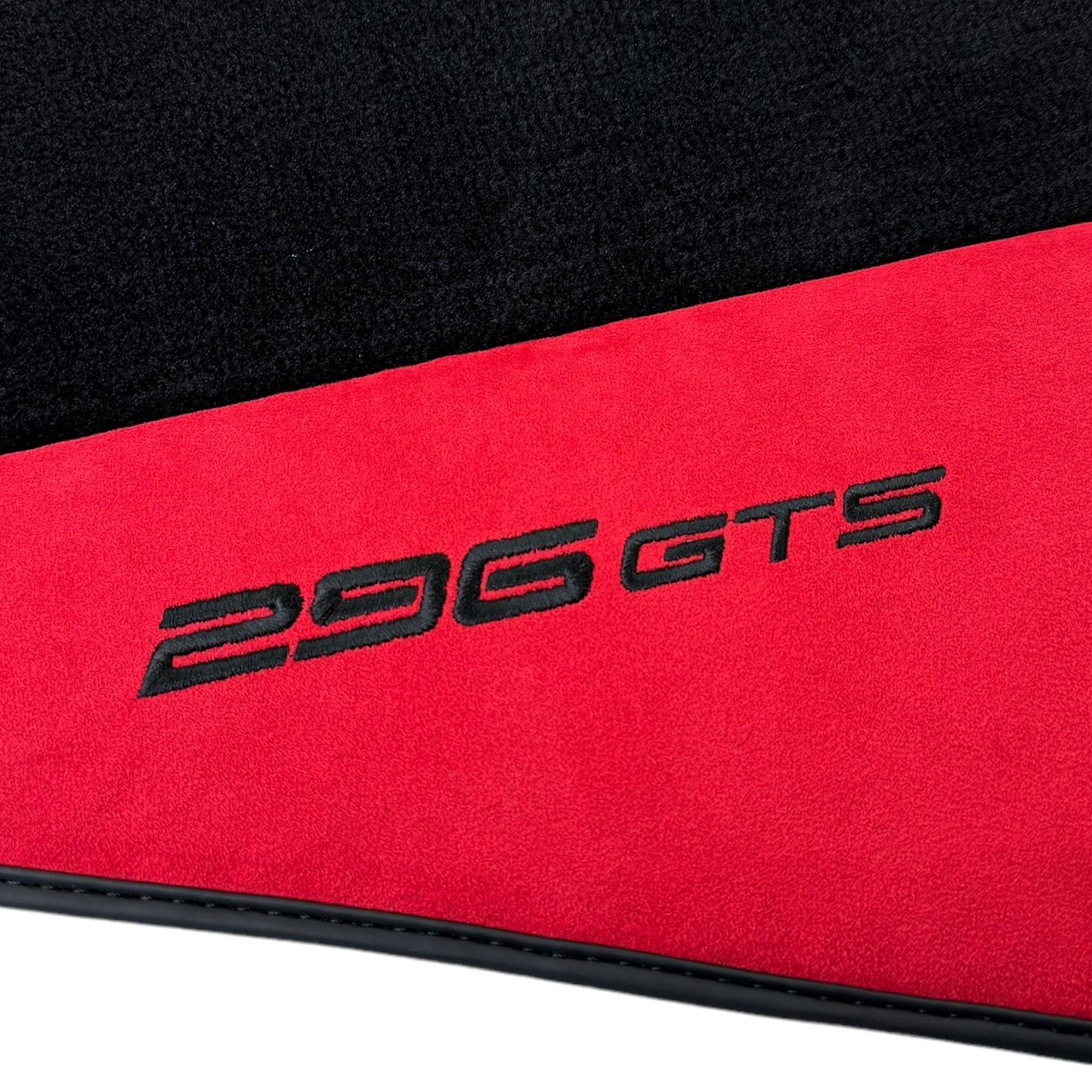 Sorte bilmatter for Ferrari 296 GTS (2022-2025) med rød Alcantara-lær