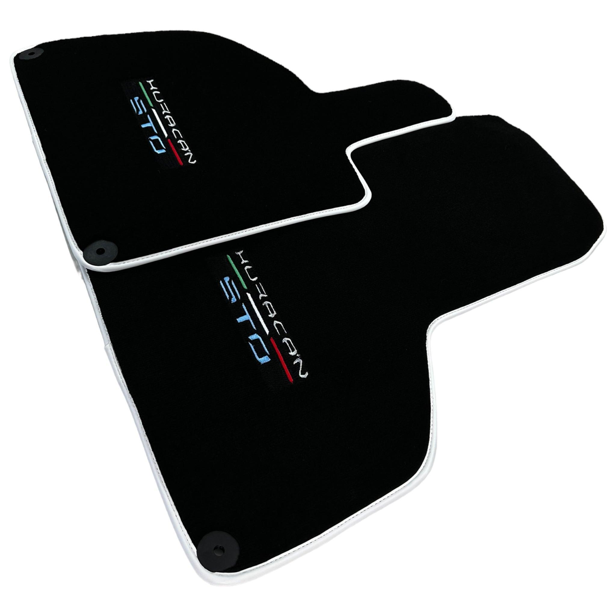 Svarte bilmatter for Lamborghini Huracan STO med hvite kanter