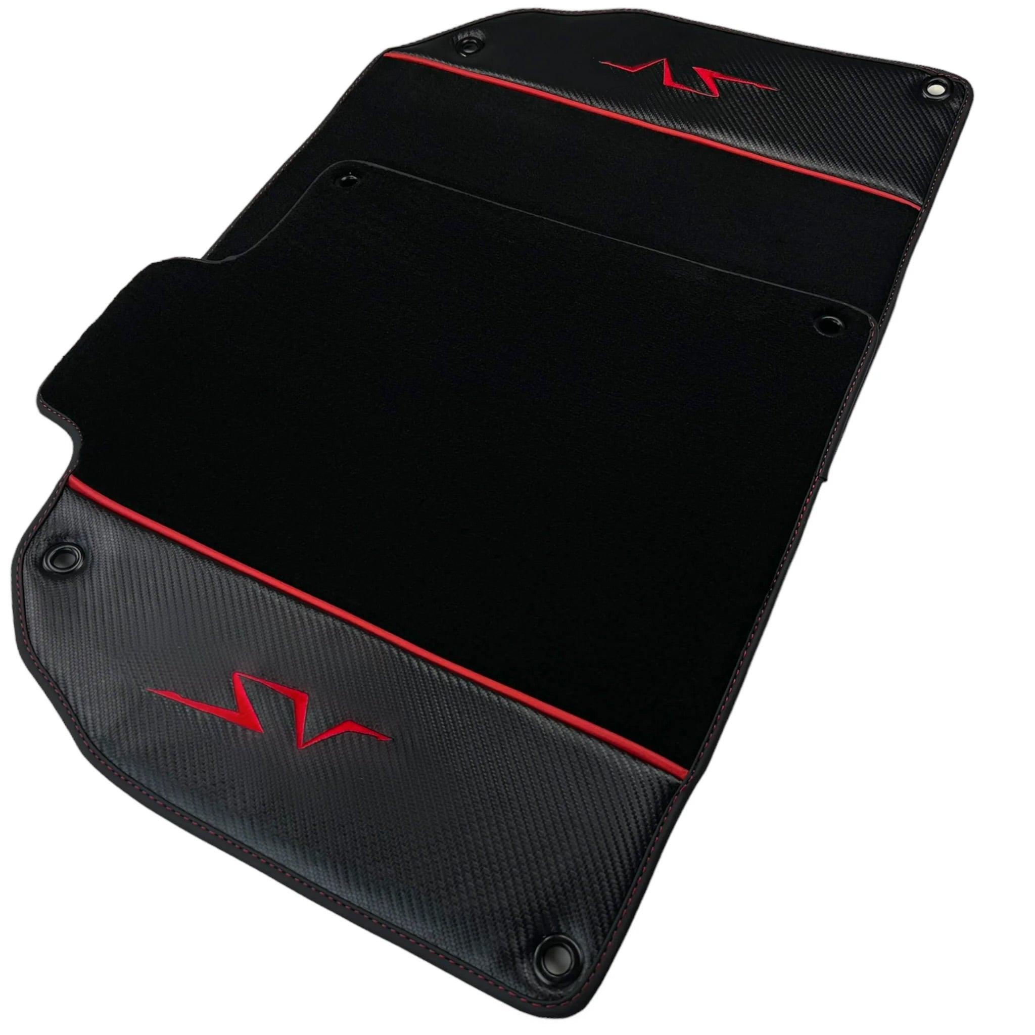 Expertly crafted for Lamborghini Aventador SV, these black floor mats feature a sleek carbon fiber design and red line accent. With a perfect fit and durable construction, they not only enhance the interior aesthetic but also provide superior protection for your vehicle's floors. Upgrade your driving experience with these premium floor mats.