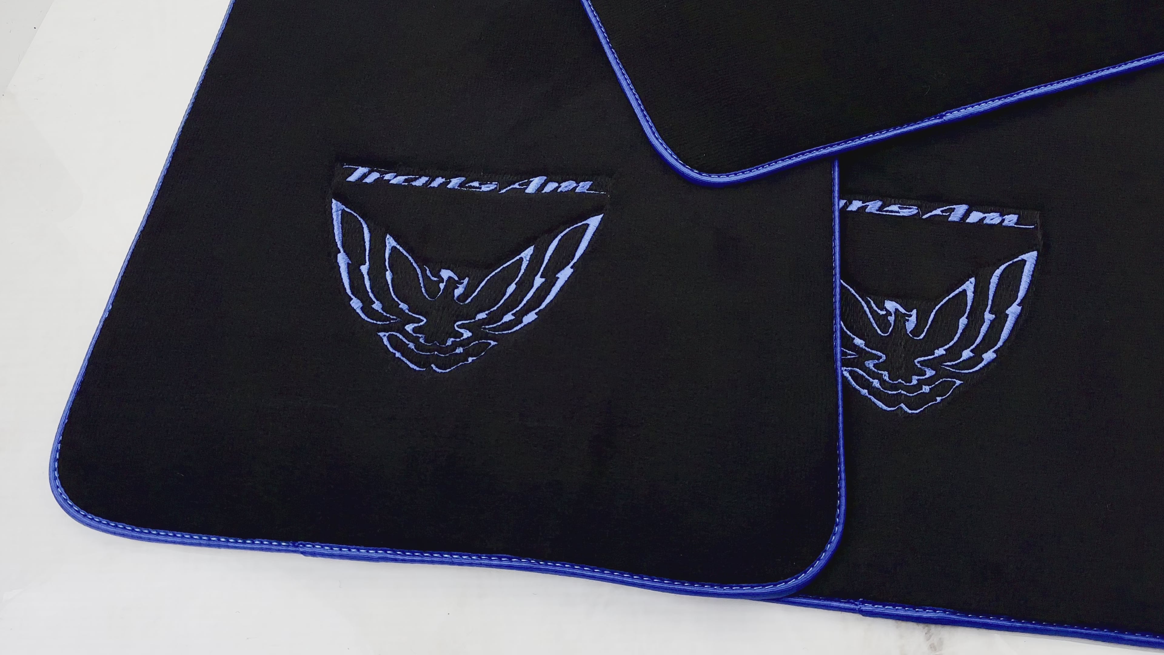 High quality black floor mats with blue trim specifically designed for Pontiac Third Generation FireBird (1982-1992) with Trans Am logo, offering a great way to protect the original car floor and refresh the interior of your classic car